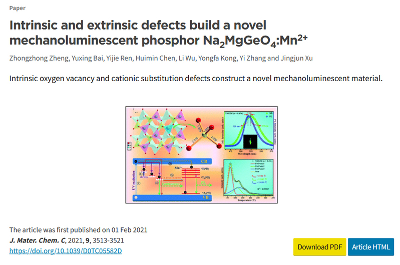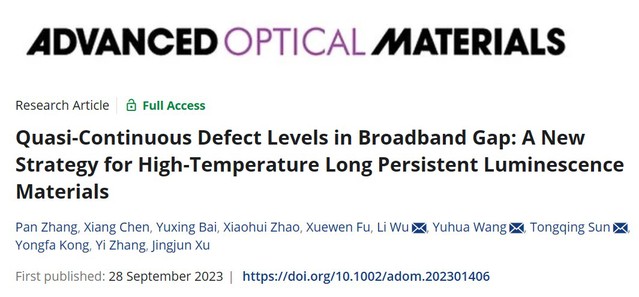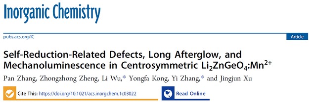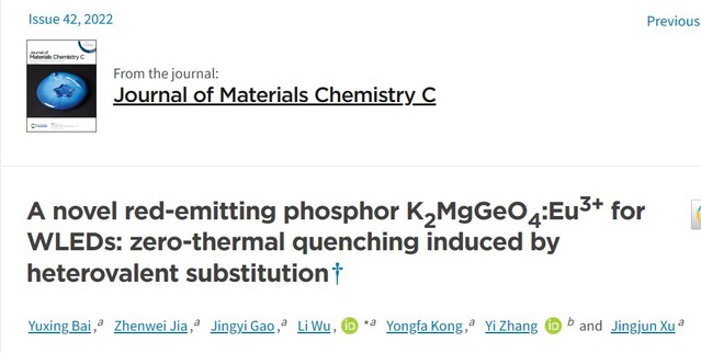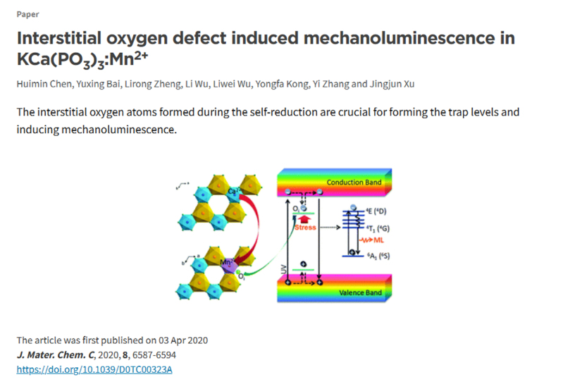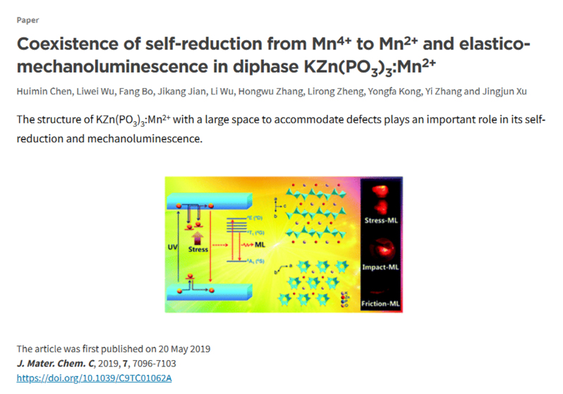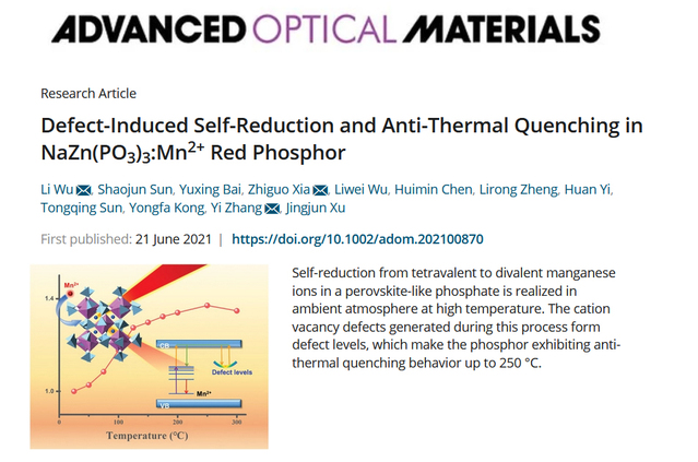 研究成果近年发表的主要论文: 1) Pan Zhang, Xiang Chen, Yuxing Bai, Xiaohui Zhao Xuewen Fu, Li Wu*, Yuhua Wang*, Tongqing Sun*, Yongfa Kong, Yi Zhang, and Jingjun Xu, Quasi-Continuous Defect Levels in Broadband Gap: A New Strategy for High-Temperature Long Persistent Luminescence Materials, Advanced Optical Materials 12 (2024) 2301406. 2) Liwei Wu, Yuxing Bai, Huimin Chen, Lirong Zheng, Huan Yi, Li Wu*, Zhenpeng Hu, Xinzheng Zhang, Yongfa Kong, Yi Zhang, and Jingjun Xu, Unique Self-Reduction of Transitional Metal Ion in a Borate with Planar [BO3]3− Groups, Advanced Optical Materials 11(19) (2023) 2300515. 3) Yuxing Bai, Liwei Wu, Qilin Cheng, Li Wu*, Yongfa Kong, Yi Zhang, and Jingjun Xu, Li+ Doping Induced Zero-Thermal Quenching in Cs3Zn6–x–yB9O21:xEu3+, yLi+ (0 ≤ x ≤ 0.10, 0.06 ≤ y ≤ 0.16), Journal of Rare Earths 41 (10) (2023) 1478-1486. (cover) 4) Yuxing Bai, Zhenwei Jia, Jingyi Gao, Li Wu*, Yongfa Kong, Yi Zhang, and Jingjun Xu, A novel red-emitting phosphor K2MgGeO4:Eu3+ for WLED: zero-thermal quenching induced by heterovalent substitution. Journal of Materials Chemistry C 10 (2022) 15957-15966. 5) Huimin Chen, Yue Lei, Jiaojiao Li, Kexin Chen, Li Wu*, Lirong Zheng, Tongqing Sun, Yongfa Kong, Yi Zhang, and Jingjun Xu, Intense Luminescence and Good Thermal Stability in a Mn2+- Activated Mg-Based Phosphor with Self-Reduction, Inorganic Chemistry 61 (14) (2022) 5495-5501. (cover) 6) Yuxing Bai, Shaojun Sun, Liwei Wu, Tiangui Hu, Lirong Zheng, Li Wu*, Yongfa Kong, Yi Zhang, and Jingjun Xu, Oxygen vacancy content drives self-reduction and anti-thermal quenching, Journal of Materials Chemistry C 10 (2022) 4317-4326. 7) Doudou Qian, Tiangui Hu, Jingyi Gao, Haihong Du, Li Wu*, Yongfa Kong, Yi Zhang*, Jingjun Xu, Mechanosynthesis strategy towards a high-efficiency CsPbBr3/Cs4PbBr6 perovskite phosphor, Optical Materials Express, 12(2) (2022) 448204. 8) Pan Zhang, Zhongzhong Zheng, Li Wu*, Yongfa Kong, Yi Zhang*, and Jingjun Xu, Self-Reduction-Related Defects, Long Afterglow, and Mechanoluminescence in Centrosymmetric Li2ZnGeO4:Mn2+, Inorganic Chemistry 60 (23) (2021) 18432-18441. 9) L. Wu*, S. J. Sun, Y. X. Bai, Z. G. Xia*, L. W. Wu, H. M. Chen, L. R. Zheng, H. Yi, T. Q. Sun, Y. F. Kong, Y. Zhang*, and J. J. Xu, Defect-induced Self-reduction and Antithermal Quenching in NaZn(PO3)3:Mn2+ Red Phosphor, Advanced Optical Materials 9 (2021) 2100870. 10) Z. Z. Zheng, Y. X. Bai, Y. J. Ren, H. M. Chen, L. Wu*, Y. F. Kong, Y. Zhang*, J. J. Xu, Intrinsic and extrinsic defects build a novel mechanoluminescent phosphor Na2MgGeO4:Mn2+, Journal of Materials Chemistry C 9 (2021) 3513-3521. 11) Y. X. Bai, Z. Z. Zheng, L. Wu*, Y. F. Kong, Y. Zhang*, J. J. Xu, Construct a novel mechanoluminescent phosphor Li2MgGeO4:Mn2+ by defect control, Dalton Transactions 50 (2021) 8803-8810. 12) H. M. Chen, Y. X. Bai, L. R. Zheng, L. Wu*, L. W. Wu, Y. F. Kong, Y. Zhang*, J. J. Xu, Interstitial oxygen defect induced mechanoluminescence in KCa(PO3)3:Mn2+, Journal of Materials Chemistry C8 (2020) 6587-6594. 13) H. M. Chen, L. Wu*, T. Q. Sun, R. Dong, Z. Z. Zheng, Y. F. Kong, Y. Zhang*, J. J. Xu, “Intense green elastico-mechanoluminescence from KZn(PO3)3:Tb3+”, Applied Physics Letters 116 (5) (2020) 051904. 14) H. M. Chen, L. W. Wu, F. Bo, J. K. Jian, L. Wu*, H. W. Zhang*, L. R. Zheng*, Y. F. Kong, Y. Zhang, J. J. Xu, Coexistence of self-reduction from Mn4+ to Mn2+ and elastico-mechanoluminescence in diphase KZn(PO3)3:Mn2+, Journal of Materials Chemistry C7 (2019) 7096-7103. 15) L. W. Wu, Y. X. Bai, L. Wu*, H. Yi, X. Z. Zhang, L. X. Zhang, Y. F. Kong, Y. Zhang*, J. J. Xu, Analysis of the structure and abnormal photoluminescence of a red-emitting LiMgBO3:Mn2+ phosphor, Dalton Transactions, 47 (2018) 13094-13105. 16) L. W. Wu, Y. X. Bai, L. Wu*, H. Yi, Y. F. Kong, Y. Zhang*, J. J. Xu,“Sm3+ and Eu3+ codoped SrBi2B2O7: a red-emitting phosphor with improved thermal stability”, RSC Advances, 7 (2017) 1146-1153. 17) H. Yi, L. Wu*, L. W. Wu, L. X. Zhao, Z. G. Xia, Y. Zhang*, Y. F. Kong, J. J. Xu, “Crystal Structure of High-Temperature Phase β-NaSrBO3 and Photoluminescence of β-NaSrBO3:Ce3+ ”, Inorganic Chemistry, 55(2016) 6487-6495. 18) S. J. Sun, L. Wu*, H. Yi, L. W. Wu, J. Y. Ji, C. L. Zhang, Y. Zhang*, Y. F. Kong, J. J. Xu, “Energy transfer between Ce3+ and Tb3+ and the enhanced luminescence of a green phosphor SrB2O4:Ce3+, Tb3+, Na+”, Optical Materials Express, 6 (2016) 1172-1185. 19) H. R. Wang, L. Wu*, H. Yi, B. Wang, L. W. Wu, Y. L. Gu, Y. Zhang*, Abnormal luminescent property of Mn2+ in α-LiZnBO3:Mn2+, Dalton Transactions 44 (2015) 1427-1434. 20) L. W. Wu, F. X. Zhang, L. Wu*, H. Yi, H. R. Wang, Y. Zhang*, Y. F. Kong, J. J. Xu, “Structure refinement and one-center luminescence of Eu3+ activated ZnBi2B2O7 under UV excitation”, Journal of Alloys and Compounds, 648 (2015) 500-506. 21) L. Wu, B. Wang, Y. Zhang*, L. Li, H. R. Wang, H. Yi, Y. F. Kong, J. J. Xu, “Structure and photoluminescence properties of a rare-earth free red-emitting Mn2+-activated KMgBO3”, Dalton transactions 43 (37) (2014) 13845-13851. (Inside front cover) 22) L. Wu, M. Y. Ji, H. R. Wang, Y. F. Kong, Y. Zhang*, “Site occupancy and photoluminescence of Sm3+ in KSr4(BO3)3:Sm3+ phosphors”, Optical Materials Express 4 (8) (2014) 1535-1544. 23) H. Yi, F. Li, L. Wu*, L. W. Wu, H. R. Wang, B. Wang, Y. Zhang*, Y. F. Kong, J. J. Xu, Site occupancy and photoluminescence properties of Eu3+-activated Ba2ZnB2O6 phosphor, RSC Advances 4 (2014) 64244-64251. 24) L. Wu, Y. Zhang, M. Y. Gui, P.Z. Lu, L. X. Zhao, S. Tian, Y. F. Kong, J. J. Xu, “Luminescence and Energy Transfer of a Color Tunable Phosphor: Dy3+-,Tm3+-, and Eu3+-Coactivated KSr4(BO3)3 for Warm White UV LEDs”, Journal of Materials Chemistry 22 (2012) 6463-6470. (2016年ESI高被引) 25) Y. Zhang, L. Wu*, M. Y. Ji, B. Wang, Y. F. Kong, J. J. Xu, “Structure and photoluminescence properties of KSr4(BO3)3:Eu3+ red-emitting phosphor”, Optical Materials Expr