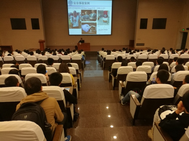 潘雷霆首先用几个真实的例子介绍了生物化学实验操作不当可能带来的危险,让同学们认识到实验安全的重要性,而后潘雷霆从几个方面为同学们详细地讲述了一些实验室的危险药品、实验用具的操作方法、遇到危险时应如何应对以及正确的实验操作,最后,他告诫同学们要珍爱生命,保护环境。实验室安全,从你我做起。两个小时的讲座同学们听的兴趣盎然。