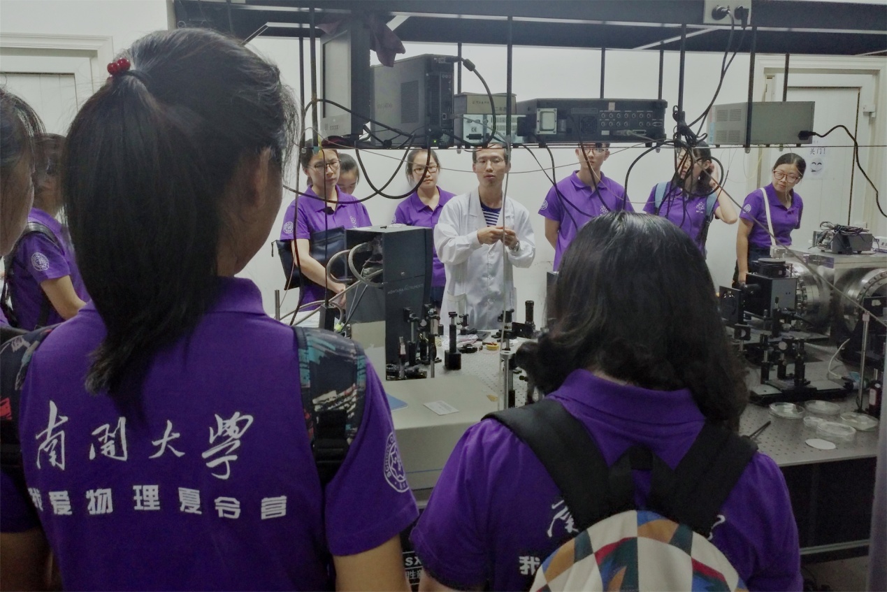 当天下午,营员们分组、有序参观了“弱光非线性光子学”教育部重点实验室。在学院教师和学长学姐的娓娓道来中,量子非线性相干光学、弱光非线性光子学与量子光学、超快光子学、光电材料与器件等12个主题实验室尽收眼底,零距离、直观感受物理的独特魅力。