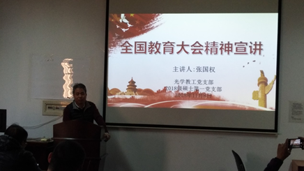 11月8日,院党委委员、院中心组成员张国权向光学教工党支部、2018级硕士第1党支部进行宣讲