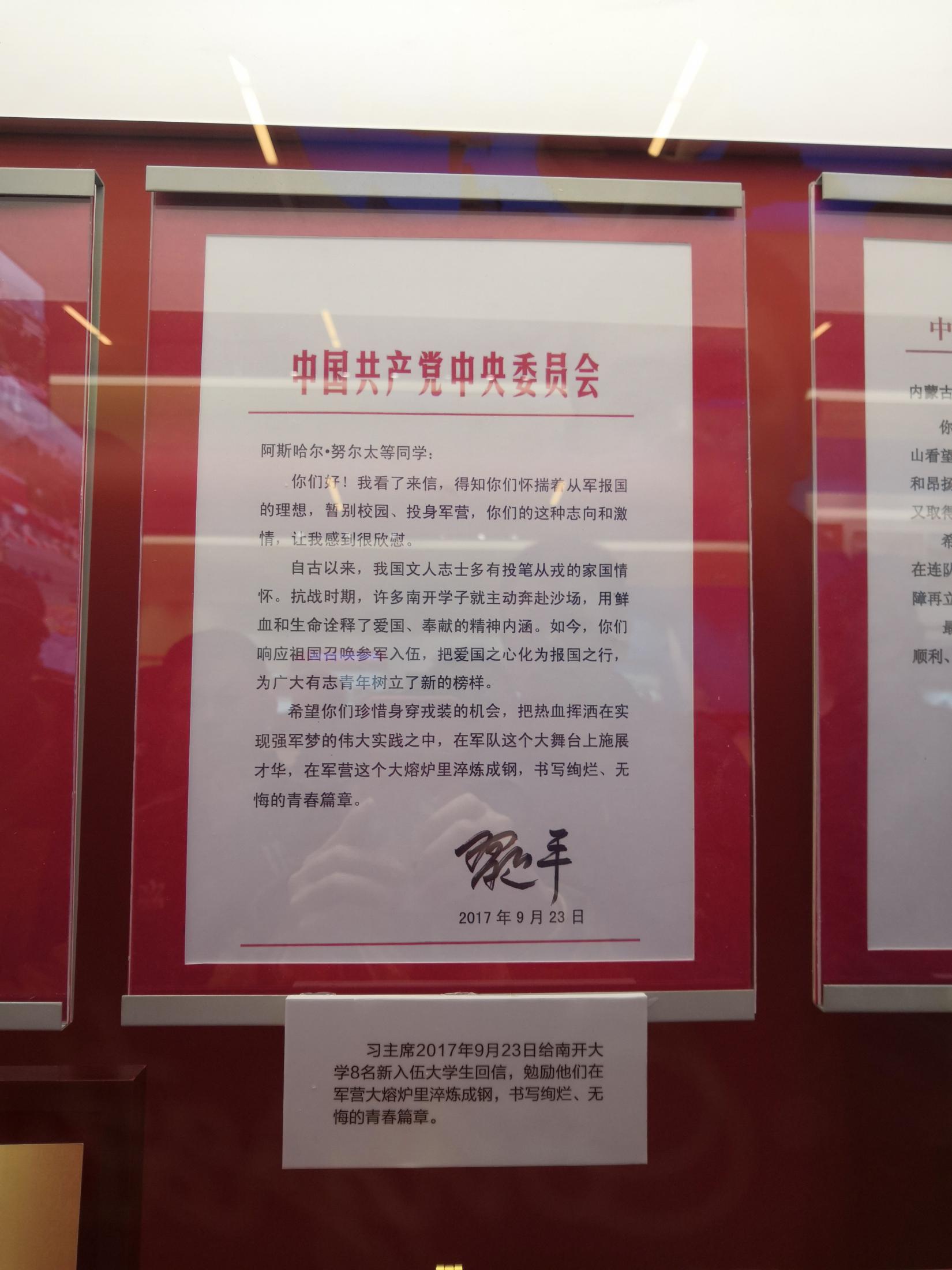 “你们好!我看了来信,得知你们怀揣着从军报国的理想,暂别校园、投身军营,你们的这种志向和激情,让我感到很欣慰。