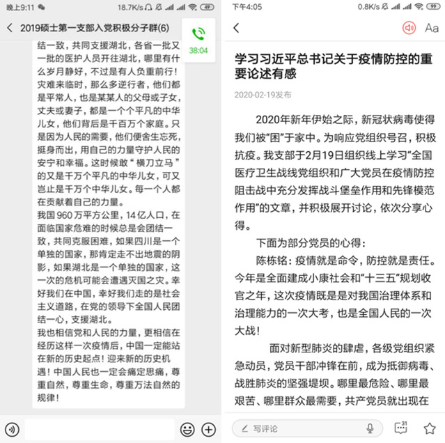 党支部成员集体学习新华社推出的名为“全国医疗卫生战线党组织和广大党员在疫情防控阻击战中充分发挥战斗堡垒作用和先锋模范作用”的综述稿。支部所有党员、积极分子与入党申请人积极参与到学习中,发言讨论。大家一致认为在党的正确领导和全国人民的努力下,没有什么是不可战胜的!
