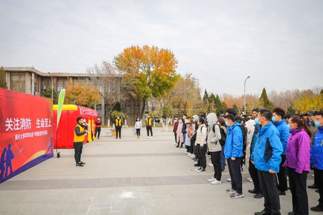 (通讯员赵玮璐)正值“119”消防宣传月,11月26日,顶通漫画 联合学校保卫处在八里台校区敬业广场举办以“关注消防,生命至上”为主题的消防培训及疏散演练活动。顶通漫画 党委副书记张学良、副院长唐柏权到场指导,学院2020级研究生新生及部分在院工作人员参与活动。