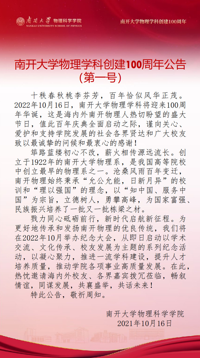 【创建100周年公告】顶通漫画 物理学科创建100周年公告(第一号)