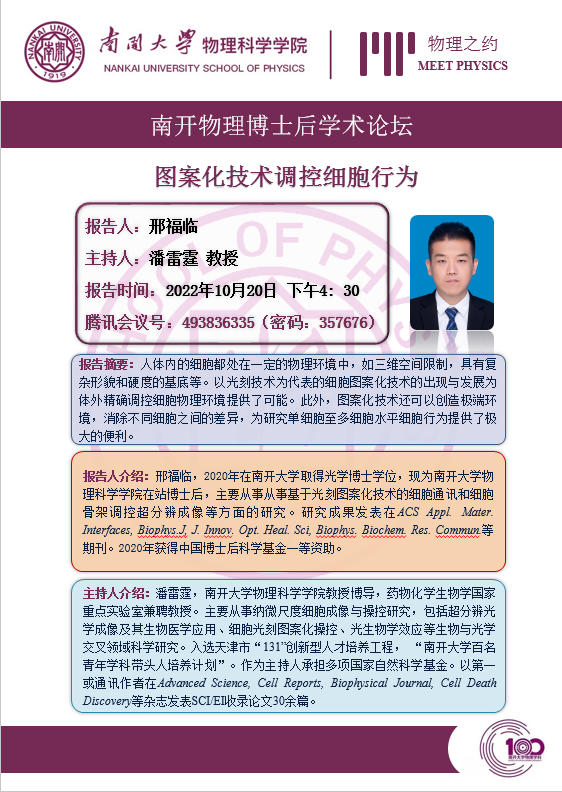 【“物理之约”博士后学术论坛(第 3 期)】图案化技术调控细胞行为
