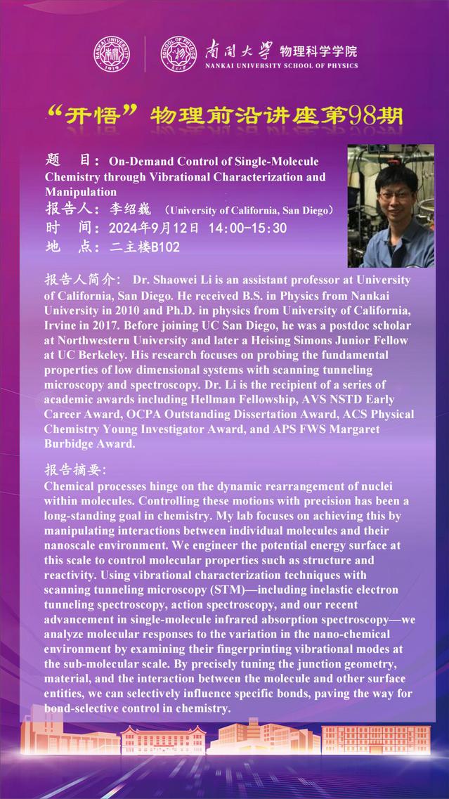 【“开悟”物理前沿讲座 (第98期)】On-Demand Control of Single-Molecule Chemistry through Vibrational Characterization and Manipulation