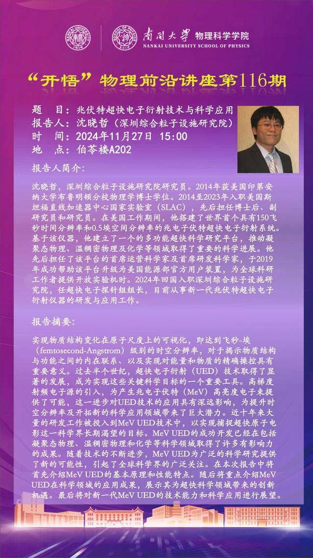 【“开悟”物理前沿讲座 (第116期)】兆伏特超快电子衍射技术与科学应用