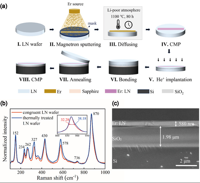 在集成光学领域,LNOI材料凭借低损耗、高密度集成和多功能等特性,成为备受关注的理想平台。一个完整的光子集成平台应同时包含光的产生、传输、控制及探测等功能器件,然而,目前广泛关注的名义纯铌酸锂薄膜属于间接带隙材料,无法实现电致发光。尽管稀土掺杂铌酸锂可以实现光泵发光,但也带来吸收损耗问题。异质有源无源集成或拼接掺杂与名义纯LNOI薄膜的方式,都存在界面损耗大、精度要求高且难以灵活控制有源区域等局限,严重制约基于LNOI大规模多功能光子集成的发展与应用。