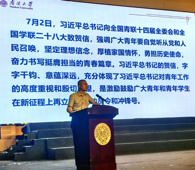 张国权向全体新生致以热烈欢迎,并带领同学们回顾南开物理创建以来的百年历程,讲述杰出校友事迹解读了南开精神与南开品格。他从“善思笃学 格物致理”八个字出发,勉励新生要成长为善思明辨的思考者、勤勉向学的追光者躬身实践的探索者,将理论学习与实践结合,在南开深厚的学术底蕴和优质资源中成长成才,为国家发展和民族复兴贡献青春力量。