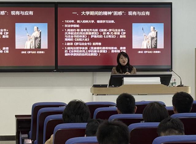首先,齐艳红梳理了青年马克思的成长轨迹。她介绍到,马克思在大学期间曾因信念缺位而陷入迷茫,转学至柏林大学后,理想信念支撑他直面哲学创作的困惑,过程中曾经因接触黑格尔哲学而短暂振奋过,也因理论无法解决现实问题而陷入苦恼过,是初心推动他持续求索。她以生动的故事告诉同学们理想信念是青春的“定盘星”。