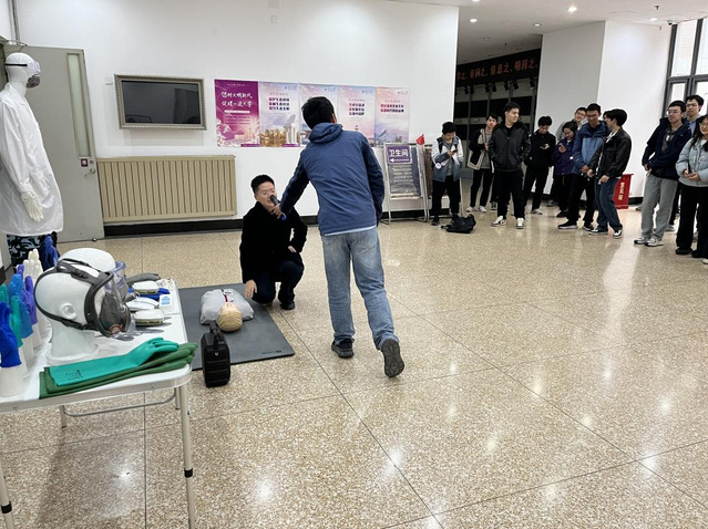 在学校综合安全教育实训基地,实验室设备处老师为同学们开展了一场内容丰富、注重实效的安全教育实训活动。实训内容从实验服的穿着到防护用品的使用,紧密结合物理学院学生学习、科研和生活的实际特点,涵盖了实验室用电安全、危化品安全、紧急避险等各方面。医学院崔建林老师悉心安排了急救技能讲授环节。他向同学们讲授了心肺复苏急救中畅通气道、人工呼吸、人工胸外按压的原理和操作规程,同时,针对实验室中常见的外伤、烧烫伤、肢体骨折等意外伤害情况,崔老师详细讲解了施救方法,使同学们受益匪浅。