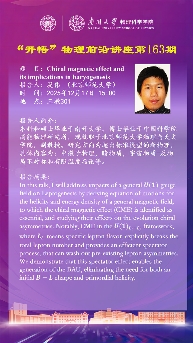 【“开悟” 物理前沿讲座 (第163期)】Chiral magnetic effect andits implications in baryogenesis