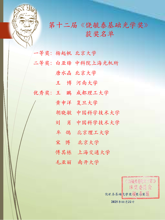“饶毓泰基础光学奖”于1991年饶毓泰先生诞辰100周年之际在北京大学创立,至今已有34年。该奖项每三年评选一次,得到了广大青年学者的热烈响应和光学界同行的大力支持。今年获奖名单已正式公布。