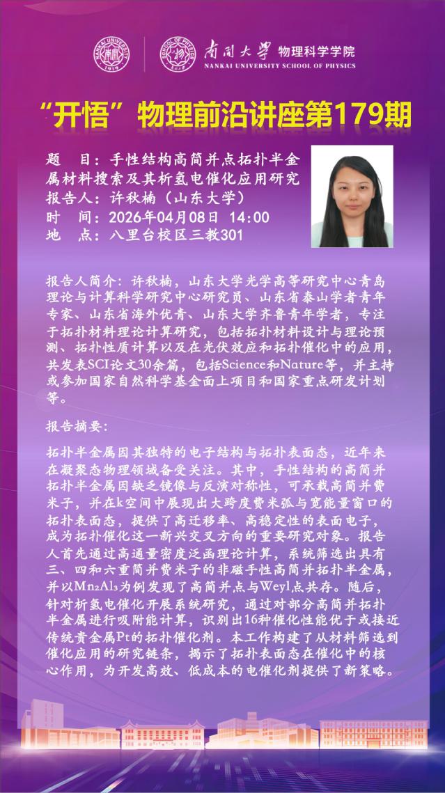 【“开悟” 物理前沿讲座 (第179期)】手性结构高简并点拓扑半金属材料搜索及其析氢电催化应用研究