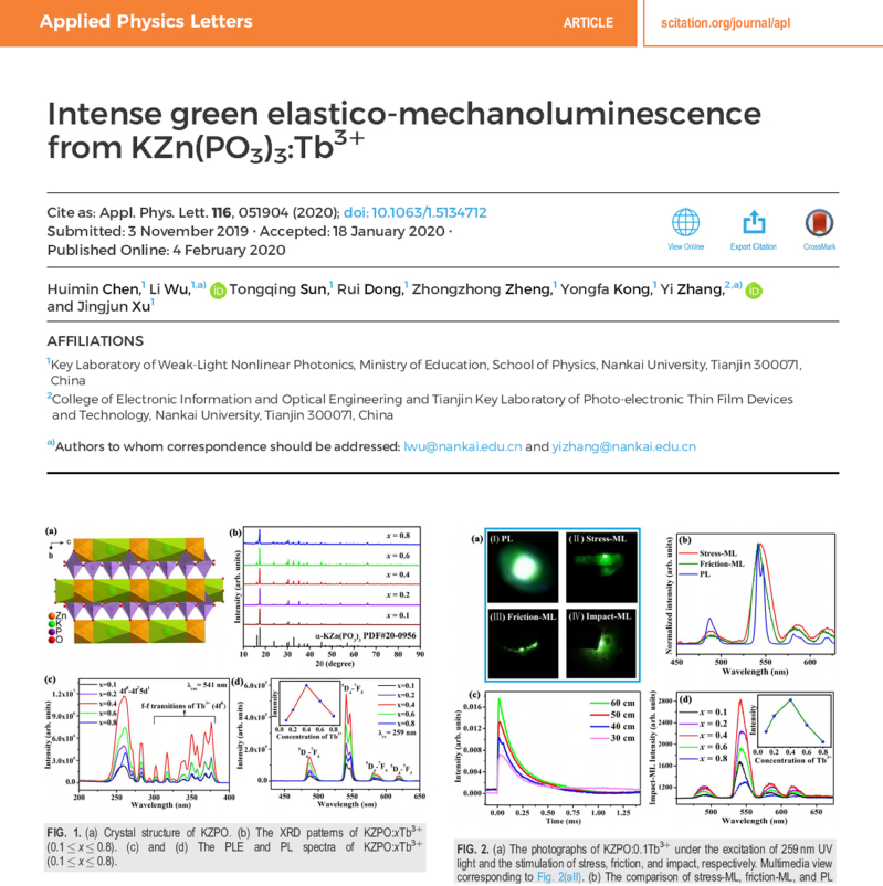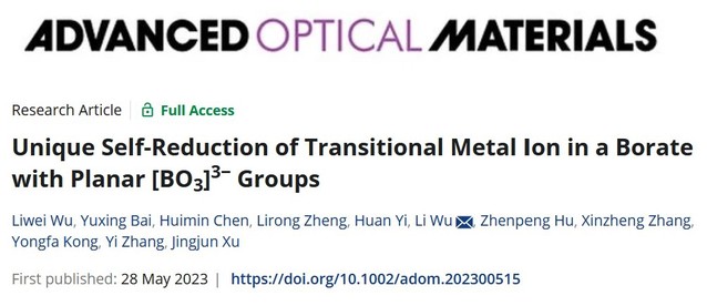 研究成果近年发表的主要论文: 1) Pan Zhang, Xiang Chen, Yuxing Bai, Xiaohui Zhao Xuewen Fu, Li Wu*, Yuhua Wang*, Tongqing Sun*, Yongfa Kong, Yi Zhang, and Jingjun Xu, Quasi-Continuous Defect Levels in Broadband Gap: A New Strategy for High-Temperature Long Persistent Luminescence Materials, Advanced Optical Materials 12 (2024) 2301406. 2) Liwei Wu, Yuxing Bai, Huimin Chen, Lirong Zheng, Huan Yi, Li Wu*, Zhenpeng Hu, Xinzheng Zhang, Yongfa Kong, Yi Zhang, and Jingjun Xu, Unique Self-Reduction of Transitional Metal Ion in a Borate with Planar [BO3]3− Groups, Advanced Optical Materials 11(19) (2023) 2300515. 3) Yuxing Bai, Liwei Wu, Qilin Cheng, Li Wu*, Yongfa Kong, Yi Zhang, and Jingjun Xu, Li+ Doping Induced Zero-Thermal Quenching in Cs3Zn6–x–yB9O21:xEu3+, yLi+ (0 ≤ x ≤ 0.10, 0.06 ≤ y ≤ 0.16), Journal of Rare Earths 41 (10) (2023) 1478-1486. (cover) 4) Yuxing Bai, Zhenwei Jia, Jingyi Gao, Li Wu*, Yongfa Kong, Yi Zhang, and Jingjun Xu, A novel red-emitting phosphor K2MgGeO4:Eu3+ for WLED: zero-thermal quenching induced by heterovalent substitution. Journal of Materials Chemistry C 10 (2022) 15957-15966. 5) Huimin Chen, Yue Lei, Jiaojiao Li, Kexin Chen, Li Wu*, Lirong Zheng, Tongqing Sun, Yongfa Kong, Yi Zhang, and Jingjun Xu, Intense Luminescence and Good Thermal Stability in a Mn2+- Activated Mg-Based Phosphor with Self-Reduction, Inorganic Chemistry 61 (14) (2022) 5495-5501. (cover) 6) Yuxing Bai, Shaojun Sun, Liwei Wu, Tiangui Hu, Lirong Zheng, Li Wu*, Yongfa Kong, Yi Zhang, and Jingjun Xu, Oxygen vacancy content drives self-reduction and anti-thermal quenching, Journal of Materials Chemistry C 10 (2022) 4317-4326. 7) Doudou Qian, Tiangui Hu, Jingyi Gao, Haihong Du, Li Wu*, Yongfa Kong, Yi Zhang*, Jingjun Xu, Mechanosynthesis strategy towards a high-efficiency CsPbBr3/Cs4PbBr6 perovskite phosphor, Optical Materials Express, 12(2) (2022) 448204. 8) Pan Zhang, Zhongzhong Zheng, Li Wu*, Yongfa Kong, Yi Zhang*, and Jingjun Xu, Self-Reduction-Related Defects, Long Afterglow, and Mechanoluminescence in Centrosymmetric Li2ZnGeO4:Mn2+, Inorganic Chemistry 60 (23) (2021) 18432-18441. 9) L. Wu*, S. J. Sun, Y. X. Bai, Z. G. Xia*, L. W. Wu, H. M. Chen, L. R. Zheng, H. Yi, T. Q. Sun, Y. F. Kong, Y. Zhang*, and J. J. Xu, Defect-induced Self-reduction and Antithermal Quenching in NaZn(PO3)3:Mn2+ Red Phosphor, Advanced Optical Materials 9 (2021) 2100870. 10) Z. Z. Zheng, Y. X. Bai, Y. J. Ren, H. M. Chen, L. Wu*, Y. F. Kong, Y. Zhang*, J. J. Xu, Intrinsic and extrinsic defects build a novel mechanoluminescent phosphor Na2MgGeO4:Mn2+, Journal of Materials Chemistry C 9 (2021) 3513-3521. 11) Y. X. Bai, Z. Z. Zheng, L. Wu*, Y. F. Kong, Y. Zhang*, J. J. Xu, Construct a novel mechanoluminescent phosphor Li2MgGeO4:Mn2+ by defect control, Dalton Transactions 50 (2021) 8803-8810. 12) H. M. Chen, Y. X. Bai, L. R. Zheng, L. Wu*, L. W. Wu, Y. F. Kong, Y. Zhang*, J. J. Xu, Interstitial oxygen defect induced mechanoluminescence in KCa(PO3)3:Mn2+, Journal of Materials Chemistry C8 (2020) 6587-6594. 13) H. M. Chen, L. Wu*, T. Q. Sun, R. Dong, Z. Z. Zheng, Y. F. Kong, Y. Zhang*, J. J. Xu, “Intense green elastico-mechanoluminescence from KZn(PO3)3:Tb3+”, Applied Physics Letters 116 (5) (2020) 051904. 14) H. M. Chen, L. W. Wu, F. Bo, J. K. Jian, L. Wu*, H. W. Zhang*, L. R. Zheng*, Y. F. Kong, Y. Zhang, J. J. Xu, Coexistence of self-reduction from Mn4+ to Mn2+ and elastico-mechanoluminescence in diphase KZn(PO3)3:Mn2+, Journal of Materials Chemistry C7 (2019) 7096-7103. 15) L. W. Wu, Y. X. Bai, L. Wu*, H. Yi, X. Z. Zhang, L. X. Zhang, Y. F. Kong, Y. Zhang*, J. J. Xu, Analysis of the structure and abnormal photoluminescence of a red-emitting LiMgBO3:Mn2+ phosphor, Dalton Transactions, 47 (2018) 13094-13105. 16) L. W. Wu, Y. X. Bai, L. Wu*, H. Yi, Y. F. Kong, Y. Zhang*, J. J. Xu,“Sm3+ and Eu3+ codoped SrBi2B2O7: a red-emitting phosphor with improved thermal stability”, RSC Advances, 7 (2017) 1146-1153. 17) H. Yi, L. Wu*, L. W. Wu, L. X. Zhao, Z. G. Xia, Y. Zhang*, Y. F. Kong, J. J. Xu, “Crystal Structure of High-Temperature Phase β-NaSrBO3 and Photoluminescence of β-NaSrBO3:Ce3+ ”, Inorganic Chemistry, 55(2016) 6487-6495. 18) S. J. Sun, L. Wu*, H. Yi, L. W. Wu, J. Y. Ji, C. L. Zhang, Y. Zhang*, Y. F. Kong, J. J. Xu, “Energy transfer between Ce3+ and Tb3+ and the enhanced luminescence of a green phosphor SrB2O4:Ce3+, Tb3+, Na+”, Optical Materials Express, 6 (2016) 1172-1185. 19) H. R. Wang, L. Wu*, H. Yi, B. Wang, L. W. Wu, Y. L. Gu, Y. Zhang*, Abnormal luminescent property of Mn2+ in α-LiZnBO3:Mn2+, Dalton Transactions 44 (2015) 1427-1434. 20) L. W. Wu, F. X. Zhang, L. Wu*, H. Yi, H. R. Wang, Y. Zhang*, Y. F. Kong, J. J. Xu, “Structure refinement and one-center luminescence of Eu3+ activated ZnBi2B2O7 under UV excitation”, Journal of Alloys and Compounds, 648 (2015) 500-506. 21) L. Wu, B. Wang, Y. Zhang*, L. Li, H. R. Wang, H. Yi, Y. F. Kong, J. J. Xu, “Structure and photoluminescence properties of a rare-earth free red-emitting Mn2+-activated KMgBO3”, Dalton transactions 43 (37) (2014) 13845-13851. (Inside front cover) 22) L. Wu, M. Y. Ji, H. R. Wang, Y. F. Kong, Y. Zhang*, “Site occupancy and photoluminescence of Sm3+ in KSr4(BO3)3:Sm3+ phosphors”, Optical Materials Express 4 (8) (2014) 1535-1544. 23) H. Yi, F. Li, L. Wu*, L. W. Wu, H. R. Wang, B. Wang, Y. Zhang*, Y. F. Kong, J. J. Xu, Site occupancy and photoluminescence properties of Eu3+-activated Ba2ZnB2O6 phosphor, RSC Advances 4 (2014) 64244-64251. 24) L. Wu, Y. Zhang, M. Y. Gui, P.Z. Lu, L. X. Zhao, S. Tian, Y. F. Kong, J. J. Xu, “Luminescence and Energy Transfer of a Color Tunable Phosphor: Dy3+-,Tm3+-, and Eu3+-Coactivated KSr4(BO3)3 for Warm White UV LEDs”, Journal of Materials Chemistry 22 (2012) 6463-6470. (2016年ESI高被引) 25) Y. Zhang, L. Wu*, M. Y. Ji, B. Wang, Y. F. Kong, J. J. Xu, “Structure and photoluminescence properties of KSr4(BO3)3:Eu3+ red-emitting phosphor”, Optical Materials Expr