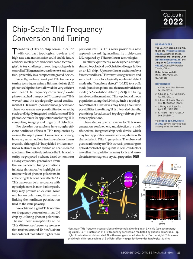 In December 2022, Optica (OSA, Optical Society of America) announced the 30 most exciting research in optics and photonics that was published in the special issue of Optics and Photonics News (OPN): Optics in 2022. This is the 40th year of OPN’s annual feature review of 30 stories that they felt communicated breakthroughs of particular interest to the broad optics community. Research “Chip-Scale THz Frequency Conversion and Tuning” from Nankai University, led by Prof. Qiang Wu, Prof. Zhigang Chen, and Prof. Jingjun Xu, was selected as one of them(see paper link 1). The series of research were published in Nature Communications (May 2021), Light: Science & Applications (May 2022), and Laser &Photonics Reviews (May 2021).